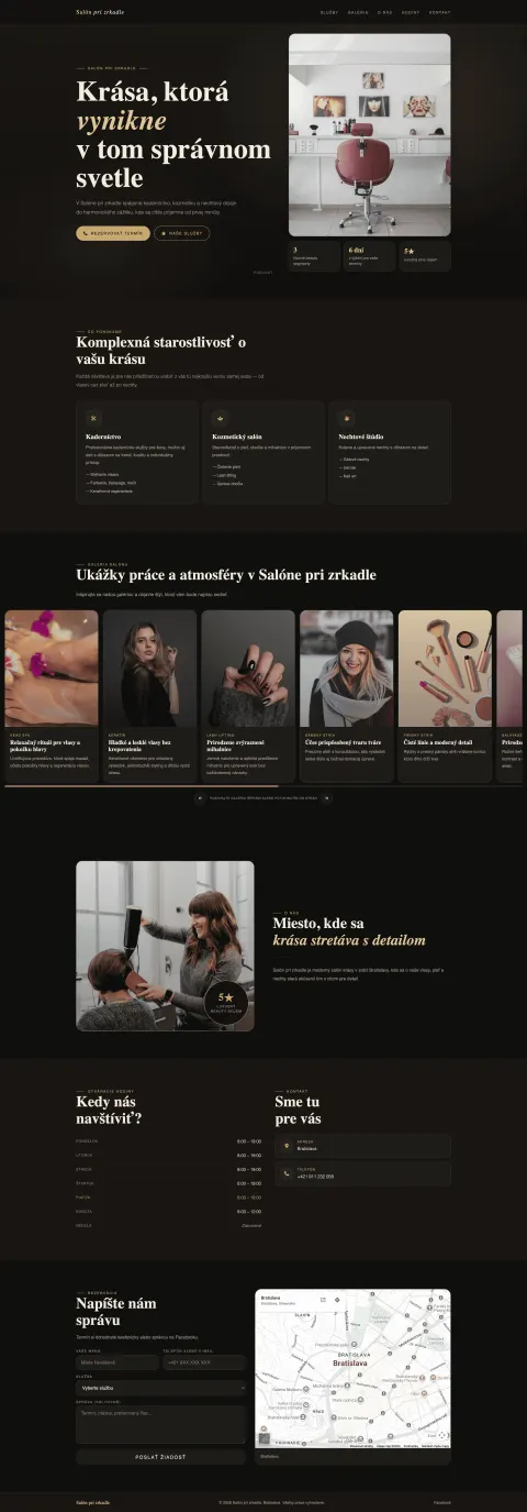 Návštevník vidí štýl salónu už z úvodnej stránky. Struktúra je nastavená na rýchly kontakt alebo rezerváciu.